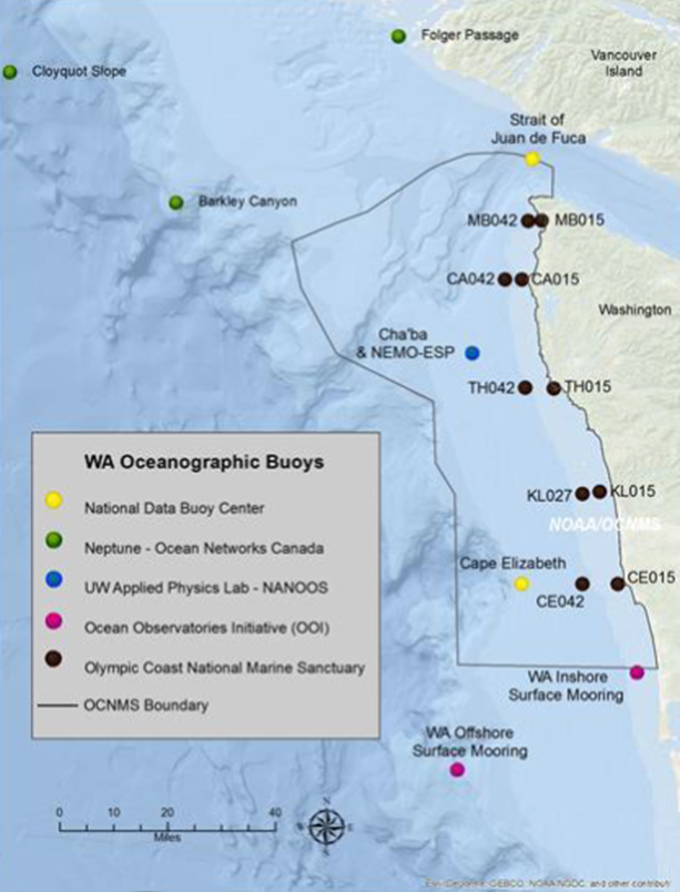 Map of oceanographic buoys on the Washington coast - to be updated soon to include recent deployments. Image Credit: NOAA